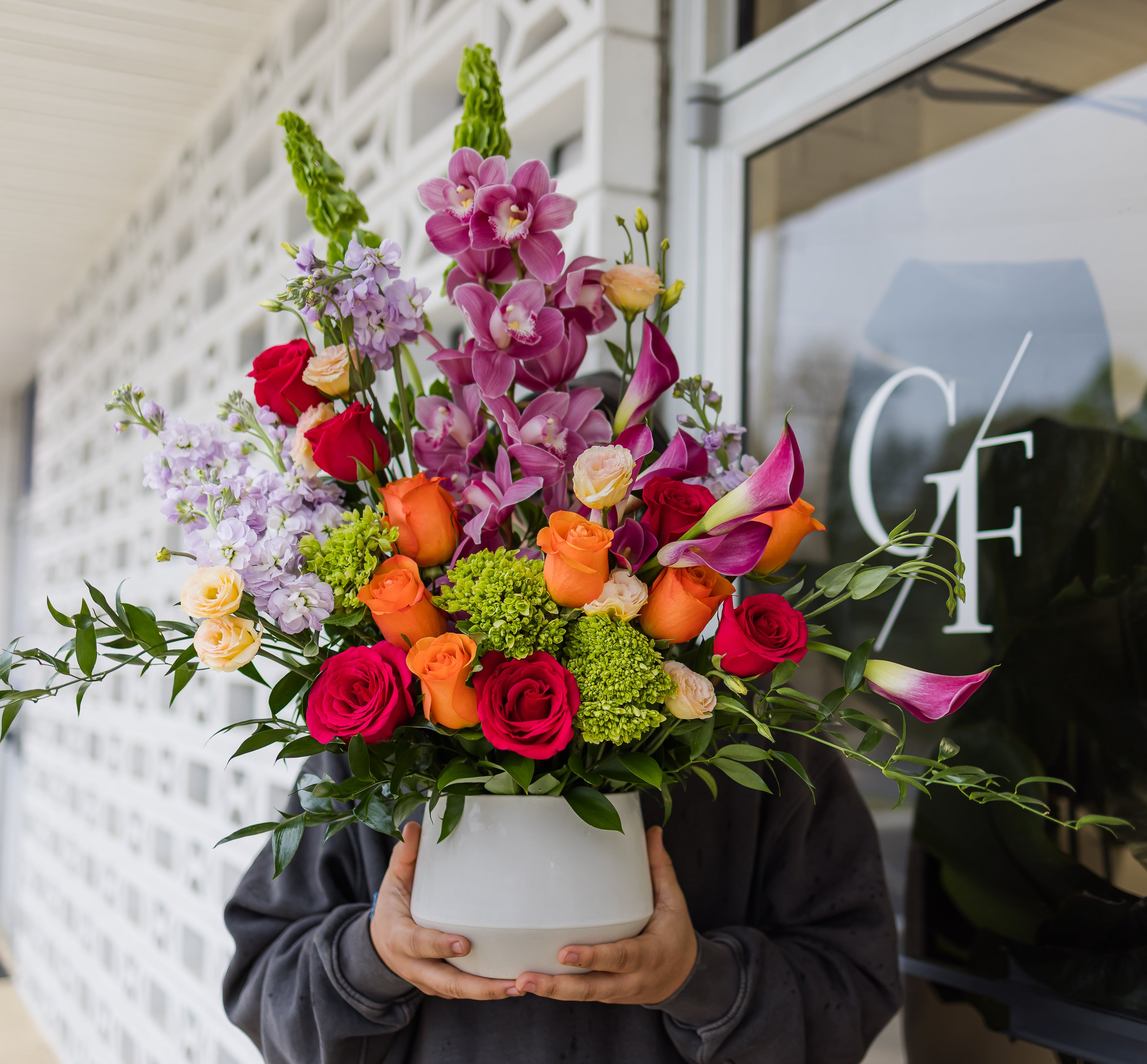 This arrangement is one-sided. Flowers include but not limited to Cymbidium Orchids, Callas, Roses, Spray Roses, Stock, Lisianthus, and greenery.