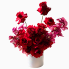 Lush red roses, symbolizing passion, with delicate pink cymbidium orchids. Set in a sleek white ceramic vase.
