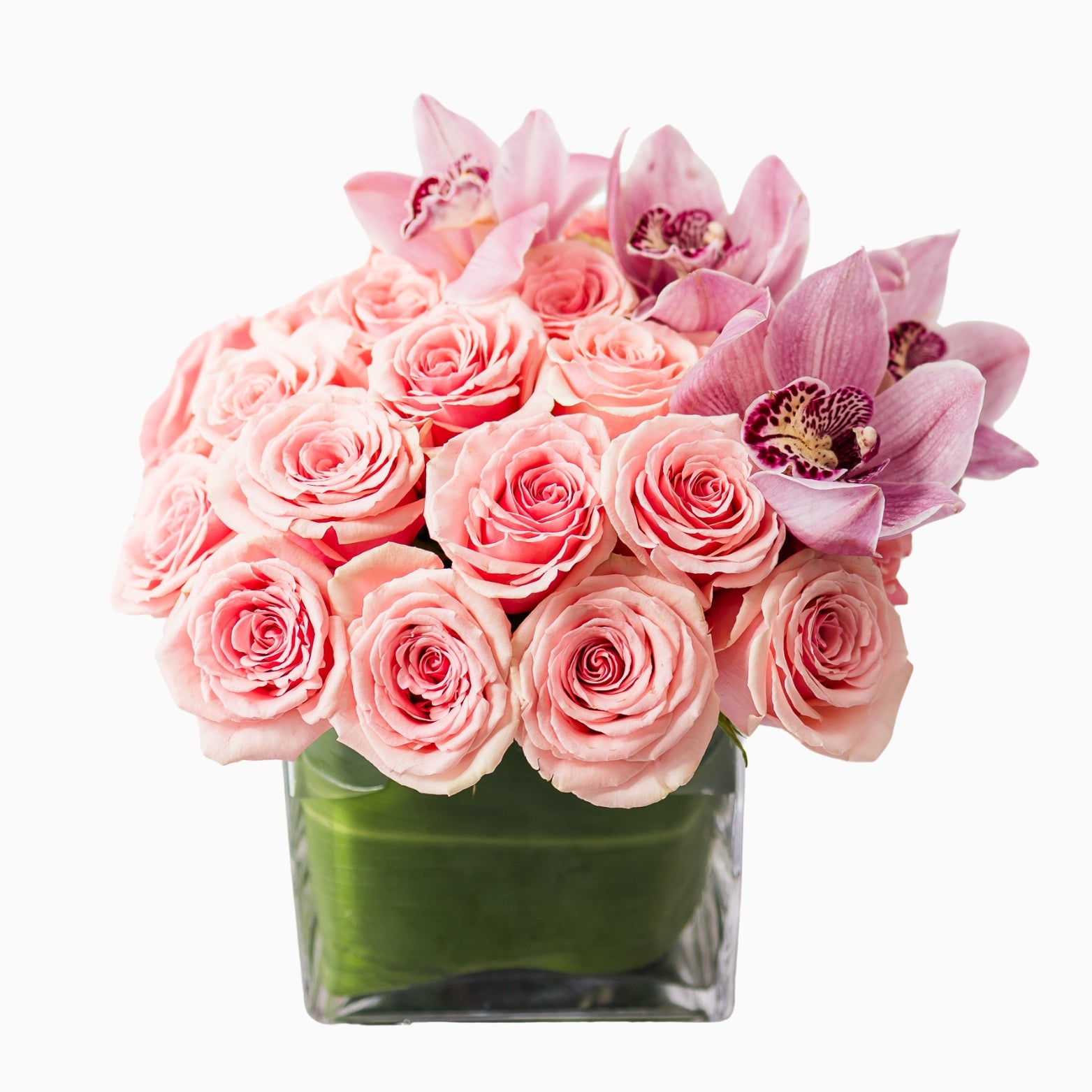 A stunning arrangement of classic roses and orchids created in a glass cube vase wrapped with a leaf.