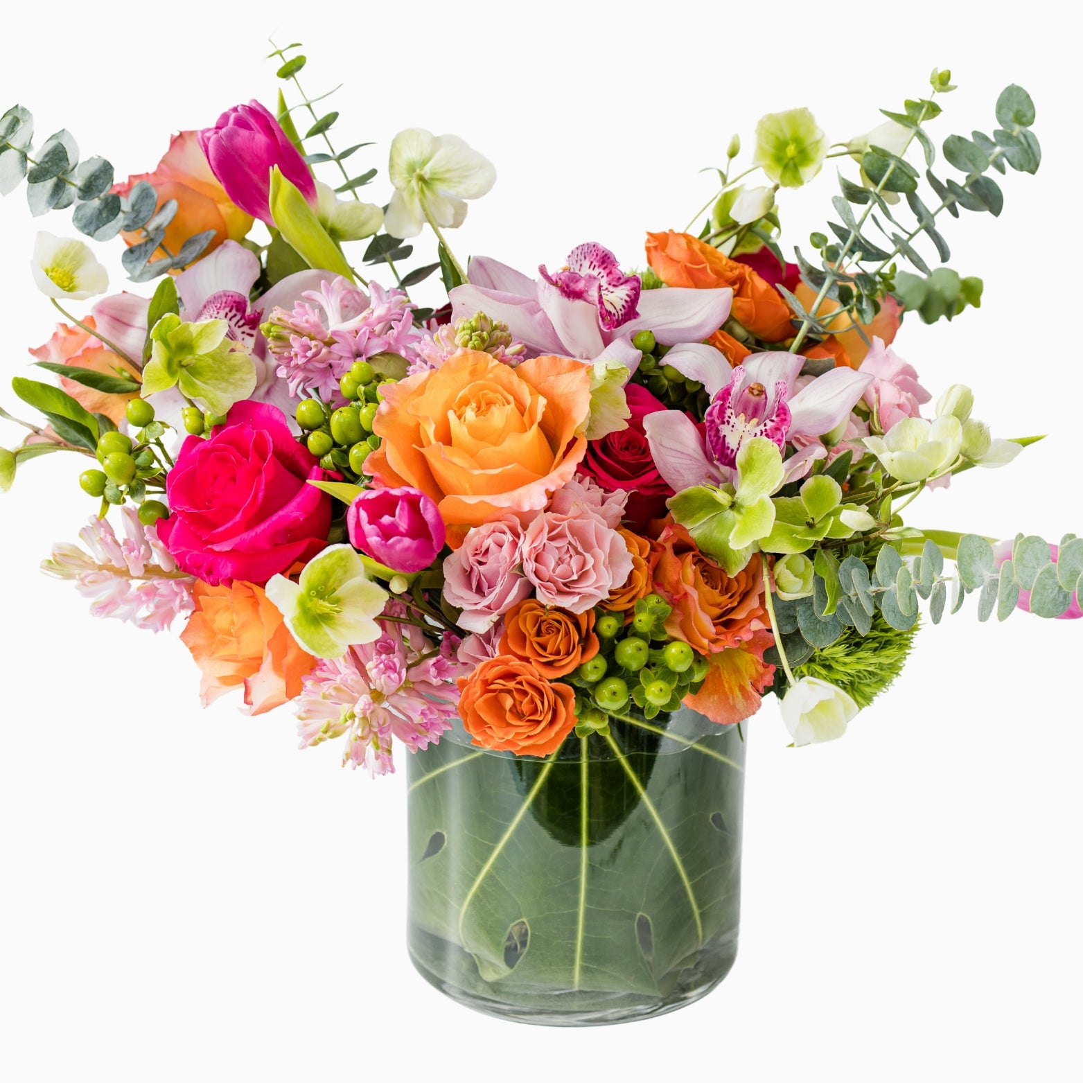 Embrace the range of beautiful colors in this gorgeous arrangement created with pink cymbidium orchids, hues of hot pink roses, spay roses and among other seasonal beauties and greenery including eucalyptus.