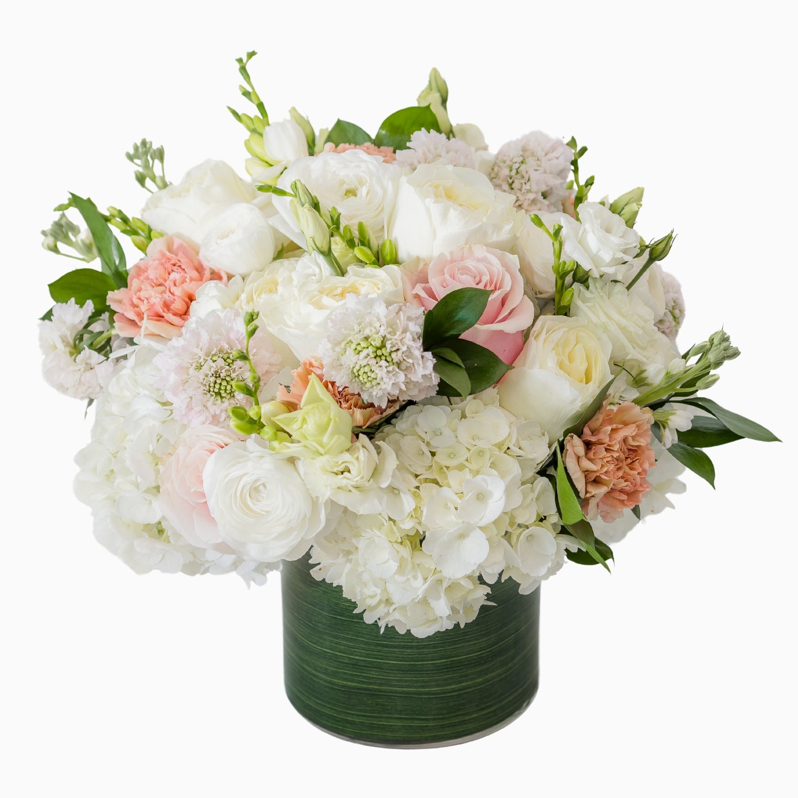 Lavish white, cream, blush, and light pink blooms. Simply elegant and perfect for any occasion!