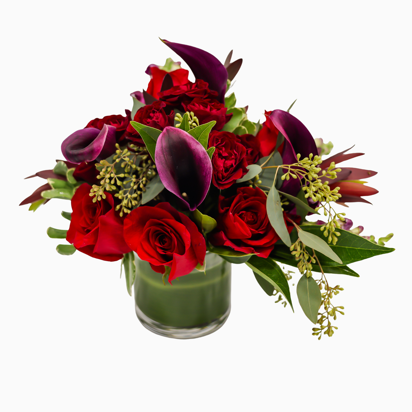 A beautiful mix petite design created with plum, deep purple callas, and deep red roses.
