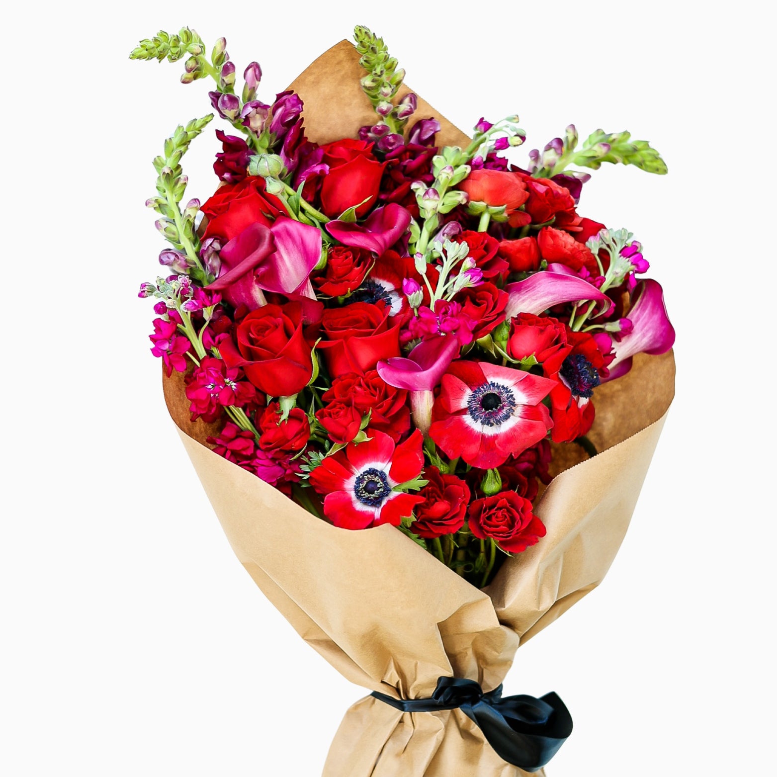Red and hot pink exquisitely wrapped florals to express your love. Depending on availability some florals may be substituted for similar ones.
