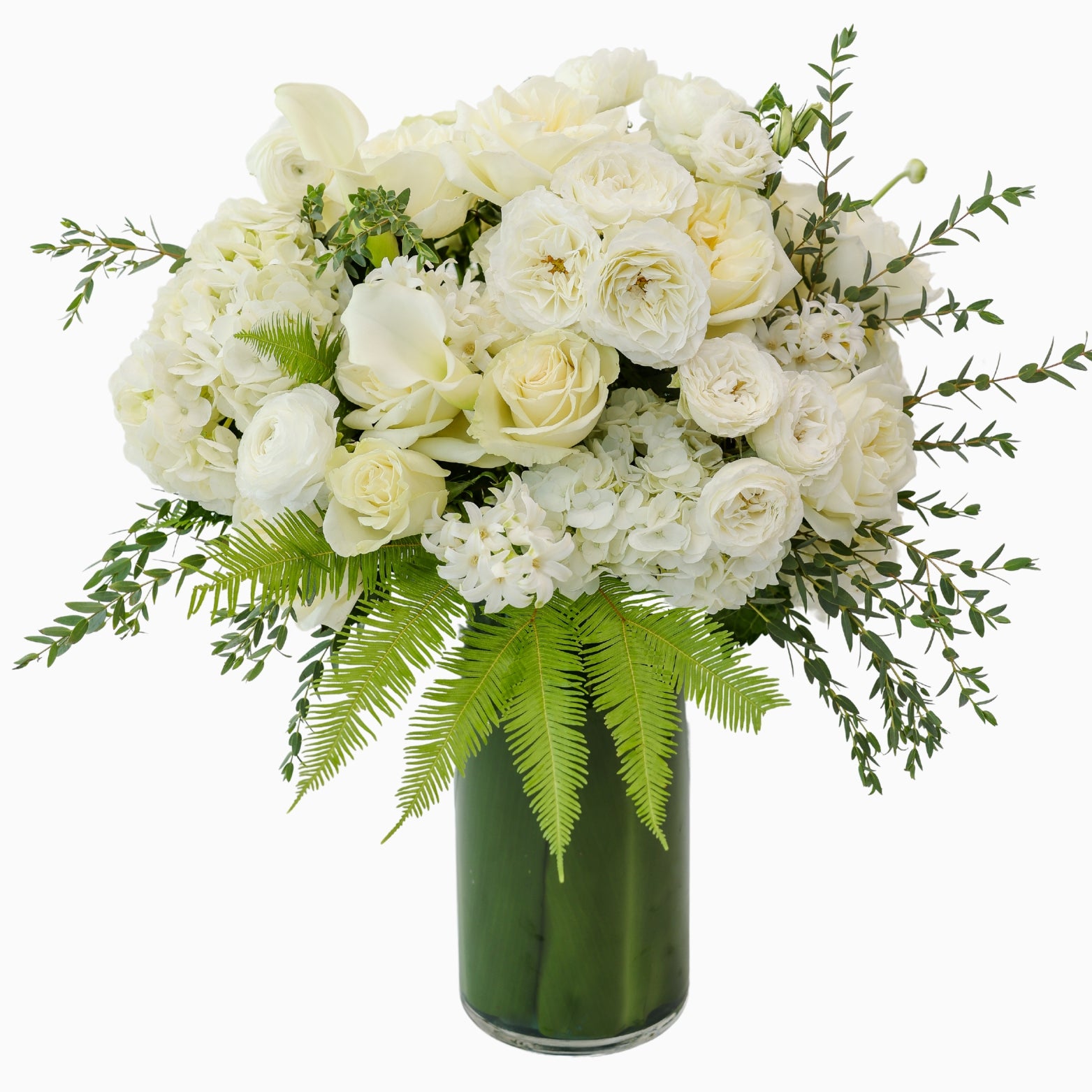 Garden mixture of white and ivory blooms set in a tall leaf-lined vase.