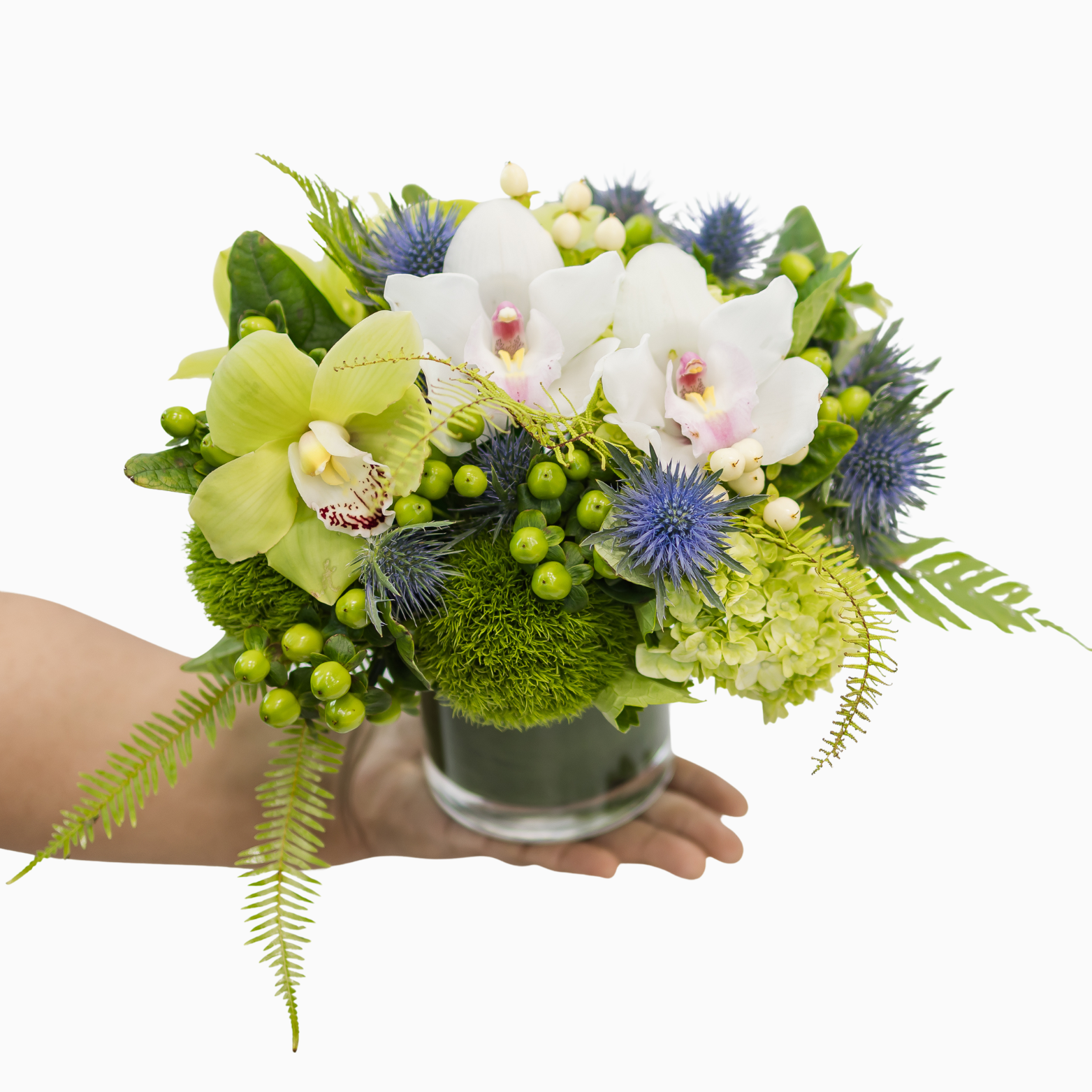 This is a Petite flower arrangement created all around. Flowers include but not limited to hydrangea, cymbidium orchids, thistle, berries, ferns.