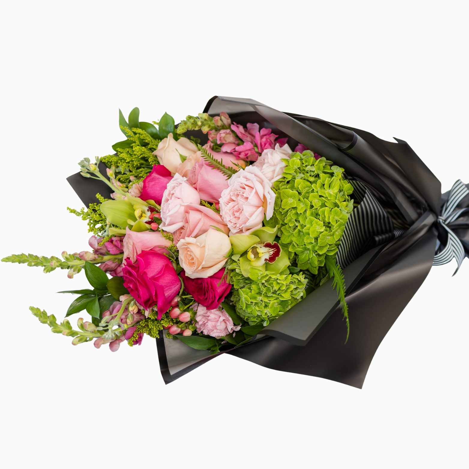 A gorgeous wrapped bouquet designed with premium pink and green blooms and greenery, hand delivered to that special someone.